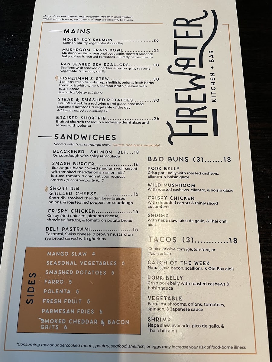 At Firewater Kitchen & Bar, we celebrate a vibrant blend of culinary creativity and locational charm. Nestled in the scenic beauty of Oakland, MD, our restaurant offers an inviting ambiance with both indoor and outdoor seating. Our story unfolds through a menu rich with flavors, from mouthwatering starters like crab hush puppies to signature plates featuring pan-seared jumbo sea scallops. Crafted with passion, our cocktails elevate every dining experience, all while our friendly staff ensures impeccable service. Each visit promises delightful dishes and a warm atmosphere, making Firewater Kitchen & Bar a gem for food lovers and a staple for locals.