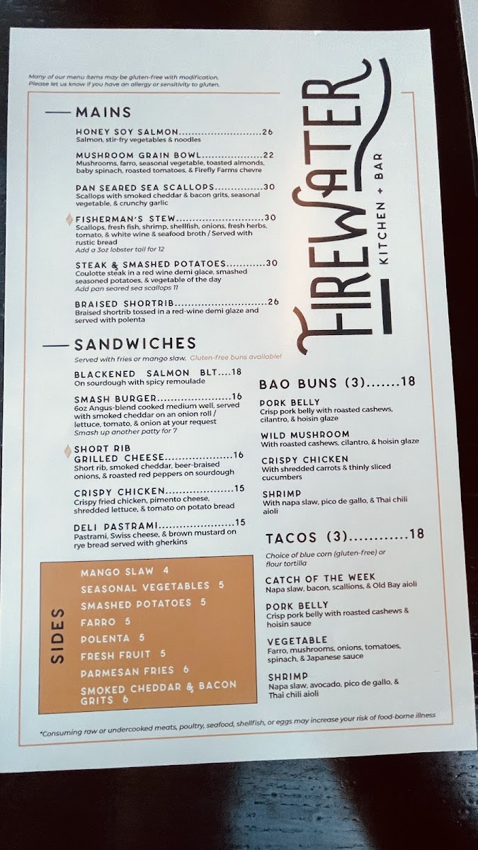 “ OUTSTANDING! We sat at the bar. Ordered drinks and an appetizer. The service staff was soooooo friendly and very willing to give drink and food recommendations. We ordered the fried green tomatoes with crab ..... mouthwatering delicious! Excellent selection of craft cocktails too. Yummy!!!! There is also outdoor seating by the water. If we lived here Firewater would definitely be our go-to restaurant! ”